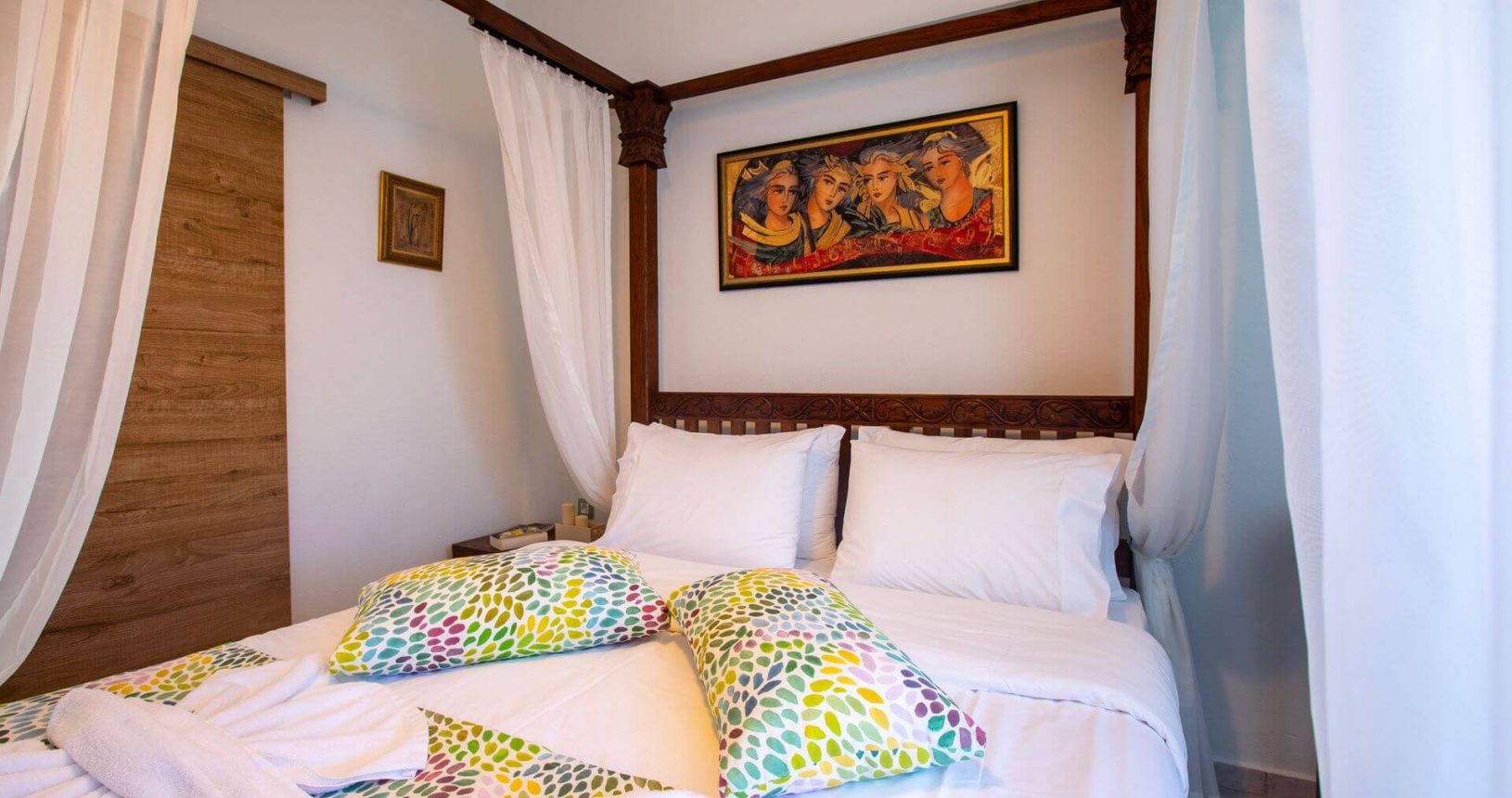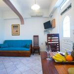 “Bougainvillea" apartment, in Kastro Apartments hostel, is the ideal suggestion for family vacations in Panormos. It is undoubtedly one of the most beautiful apartments of the hostel and squats by a big and incredible bougainvillea. The recently revamped apartment can host a four member family or a group of friends, as it sports a double bed bedroom and canopy as well as a sofa bed. In its fully equipped kitchen, you can prepare easy meals to enjoy in the dining room.